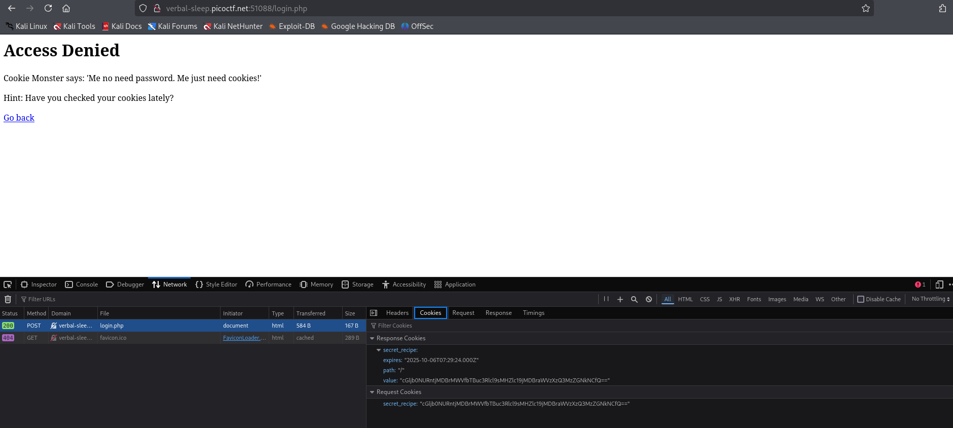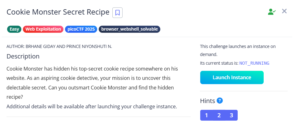 Cookie Monster Secret Recipe is an Easy Web Exploitation challenge from picoCTF 2025. It has almost 30,000 user solves as of writing this.