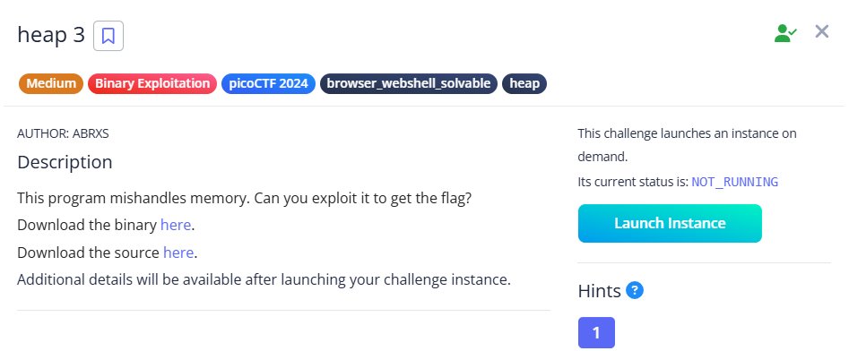 Heap 3 is a Medium Binary Exploitation challenge from picoCTF 2024. It has around 4,000 user solves as of writing this.